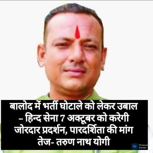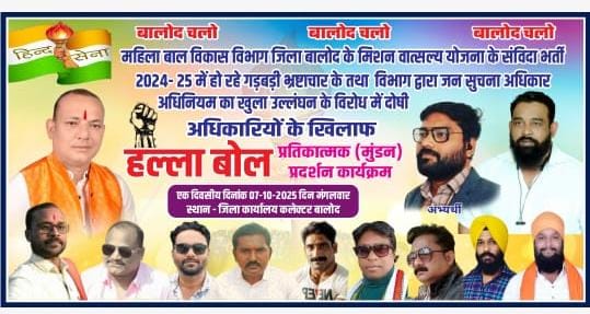 यहां भी ईमानदारी सिर्फ कागज़ों पर है। मेहनती युवाओं को दरकिनार कर रसूख़दारों और चहेतों को प्राथमिकता दी गई। शिकायतें लगातार उठ रही हैं लेकिन जिला प्रशासन मौन है। यही मौन इस बात का सबूत है कि ईमानदारी का दावा सिर्फ़ दिखावा है।युवाओं का धैर्य अब टूट चुका है। हिंद सेना ने साफ ऐलान किया है कि 07 अक्टूबर 2025 को कलेक्टोरेट के सामने प्रतिकात्मक प्रदर्शन होगा। उद्देश्य यही है कि जब तक भ्रष्टाचारियों का सिर झुककर शर्मिंदा नहीं होगा, तब तक संगठन के सदस्य अपना सिर मुंडवाकर यह दिखाएँगे कि जनता अब और अन्याय बर्दाश्त नहीं करेगी। यह विरोध केवल नारों का खेल नहीं, बल्कि सत्ता और प्रशासन की दोहरी चाल पर तीखा प्रहार है।इस आंदोलन को ओबीसी महासभा और अन्य संगठनों का भी समर्थन मिल चुका है। आंदोलन की अगुवाई कर रहे तरुणनाथ योगी ने दो टूक कहा है—अगर दोषियों पर कार्रवाई नहीं हुई, तो यह लड़ाई बालोद से निकलकर पूरे प्रदेश में लहर की तरह फैलेगी। यह केवल भर्ती घोटाले का विरोध नहीं, बल्कि युवाओं के भविष्य की रक्षा और जनता की गरिमा की लड़ाई है।अब जनता पूछ रही है — पुराने विभाग की लूट पर मौन क्यों थे और नई भर्ती की धांधली पर खामोश क्यों हैं? हिंद सेना का उद्देश्य साफ है: जब तक भ्रष्टाचारियों को सजा नहीं मिलेगी, तब तक संघर्ष जारी रहेगा।