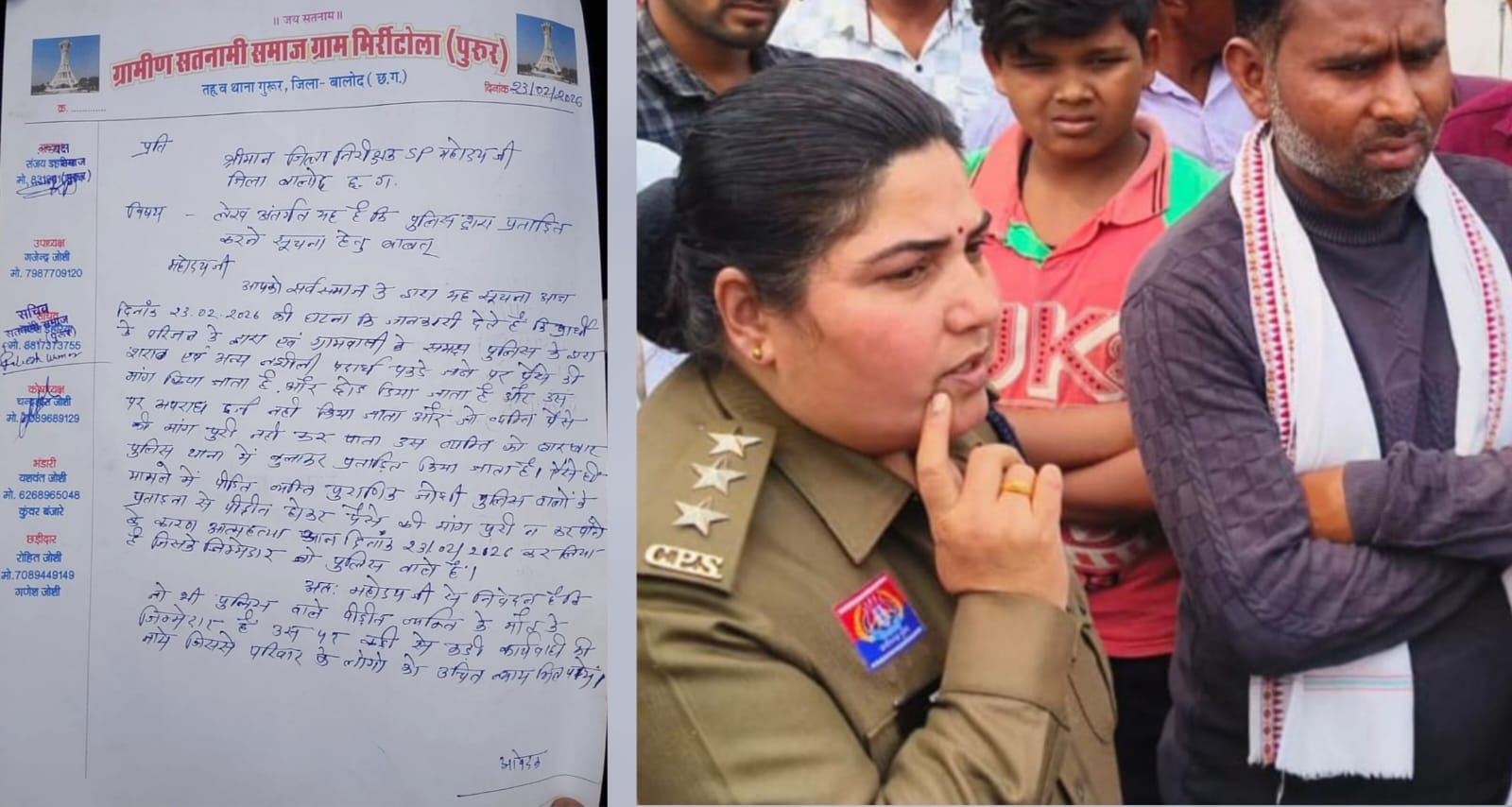 बालोद :- छत्तीसगढ़ के बालोद जिले में पुरूर थाना क्षेत्र से सामने आई घटना अब सिर्फ एक आत्महत्या की खबर नहीं रही, बल्कि यह कानून व्यवस्था, पुलिस आचरण और नागरिक अधिकारों की कसौटी बन गई है। ग्रामीणों ने खुलकर आरोप लगाए हैं कि भुजबल, सोनी और जैन नाम के तीन पुलिसकर्मियों द्वारा दबाव बनाया गया, बार-बार थाना बुलाया गया और पैसों की मांग की गई। यदि यह सच साबित होता है, तो यह मामला केवल विभागीय चूक नहीं, बल्कि विधिक उल्लंघन का गंभीर उदाहरण माना जाएगा।
