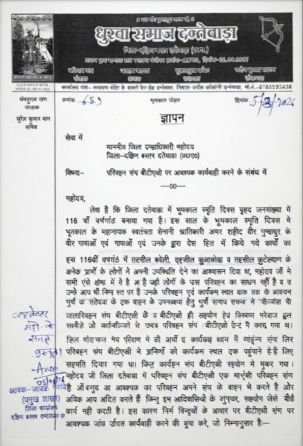 बस्तर:- छत्तीसगढ़ के जिला दंतेवाड़ा की धरती, जो शौर्य और संघर्ष की गाथाओं से भरी हुई है, वहां एक बार फिर आदिवासी समाज ने अपने अधिकारों और सम्मान की रक्षा के लिए मजबूत कदम उठाया है। जिला धुरवा समाज दंतेवाड़ा ने 5 मार्च 2026 को जिला कलेक्टर को एक महत्वपूर्ण ज्ञापन सौंपते हुए परिवहन संघ BTOA की कार्यप्रणाली पर गंभीर सवाल खड़े किए और पूरे मामले की निष्पक्ष जांच की मांग की दरअसल, इस वर्ष दंतेवाड़ा जिले में भूमकाल स्मृति दिवस की 116वीं वर्षगांठ बड़े पैमाने पर मनाने की तैयारी की गई थी। यह आयोजन केवल एक कार्यक्रम नहीं बल्कि आदिवासी अस्मिता, संघर्ष और गौरव का प्रतीक था। स्वतंत्रता संग्राम के महानायक क्रांतिवीर अमर शहीद गुंडाधुर की वीरता और बलिदान को याद करते हुए हजारों लोगों के जुटने की योजना बनाई गई थी। कटेकल्याण, कुआकोण्डा, गीदम, बारसूर, बचेली और दंतेवाड़ा सहित कई क्षेत्रों के ग्रामीणों ने इसमें शामिल होने की सहमति भी जताई थी।ग्रामीणों को कार्यक्रम स्थल तक पहुंचाने के लिए जिले के एकमात्र परिवहन संगठन BTOA से वाहन उपलब्ध कराने का आग्रह किया गया था, जिस पर प्रारंभ में सहमति भी दी गई थी। लेकिन आयोजन के दिन अचानक परिवहन संघ पीछे हट गया। इस अप्रत्याशित रवैये के कारण बड़ी संख्या में ग्रामीण कार्यक्रम में शामिल नहीं हो सके और ऐतिहासिक आयोजन प्रभावित हो गया। इस घटना ने समाज में आक्रोश और निराशा दोनों को जन्म दिया।धुरवा समाज ने अपने ज्ञापन में स्पष्ट कहा कि जिले में लौह अयस्क परिवहन से करोड़ों की कमाई करने वाला यह संघ स्थानीय समाज के प्रति अपनी जिम्मेदारी निभाने में पूरी तरह विफल साबित हो रहा है। इसी कारण संगठन की स्थापना से अब तक की आर्थिक गतिविधियों की गहन जांच की मांग उठाई गई है।इसके साथ ही यह भी आरोप लगाया गया कि संघ में बाहरी राज्यों के लोगों को मनमाने तरीके से सदस्य बनाया जा रहा है, जबकि स्थानीय युवाओं को अवसर नहीं दिया जा रहा। कई वाहनों के दूसरे जिलों से जुड़े होने की भी आशंका जताई गई, जिसकी जांच आवश्यक बताई गई।समाज ने यह भी मुद्दा उठाया कि नए सदस्यों को जोड़ते समय ग्राम सभाओं और स्थानीय मूल निवासियों को कोई जानकारी नहीं दी जाती, जिससे रोजगार के अवसर छिन रहे हैं। पेसा कानून लागू होने के बावजूद संघ के शीर्ष पद पर आदिवासी प्रतिनिधित्व नहीं होना भी गंभीर सवाल खड़ा करता है।इतना ही नहीं, आदिवासी जमीनों पर कब्जा कर भवन निर्माण और वन भूमि में ट्रकों की अवैध पार्किंग जैसे मामलों को भी प्रशासन के सामने रखा गया। इन सभी बिंदुओं पर ठोस जांच और दोषियों के विरुद्ध कड़ी कार्रवाई की मांग की गई।जिला कलेक्टर ने पूरे मामले को गंभीरता से लेते हुए निष्पक्ष जांच और उचित कार्रवाई का आश्वासन दिया है। अब निगाह
